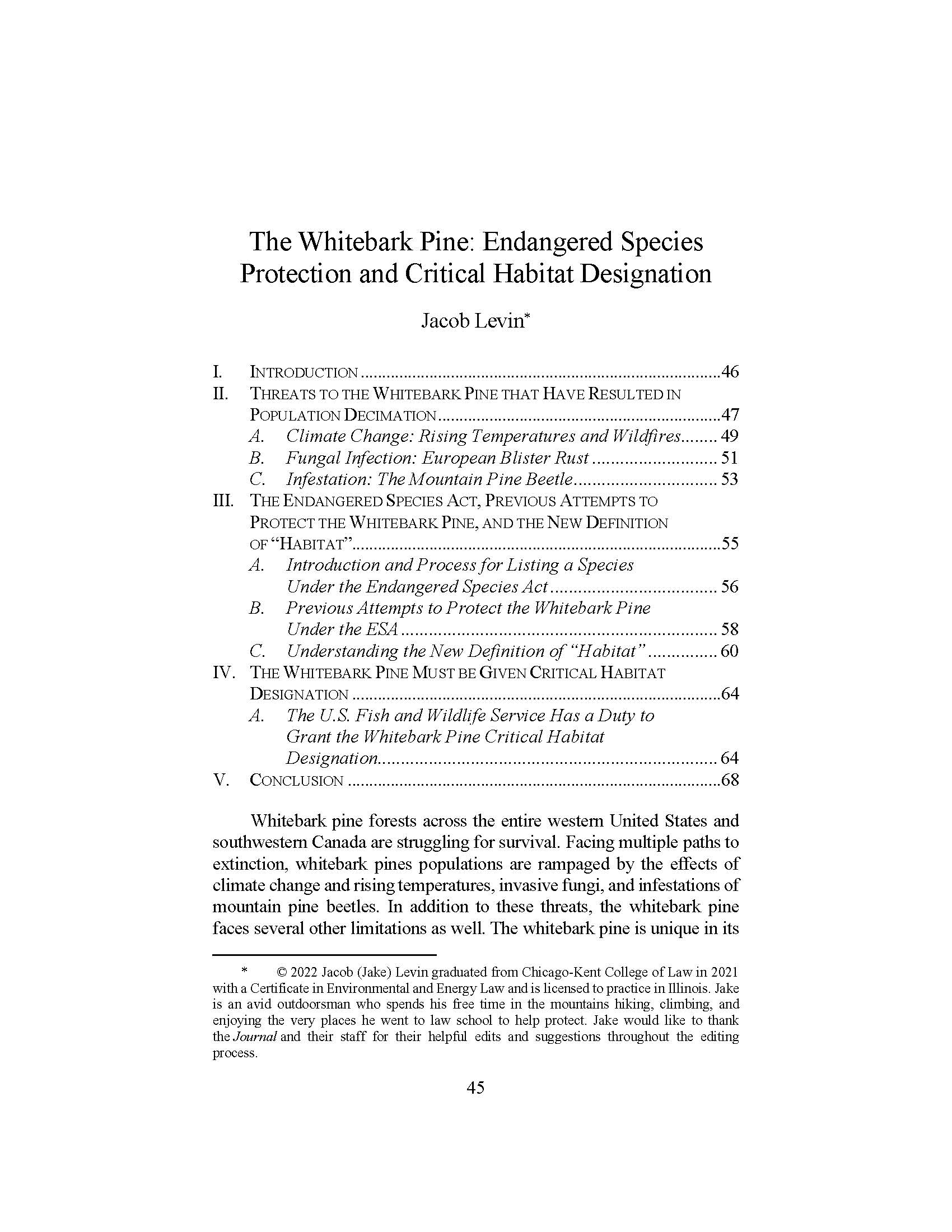 The Whitebark Pine: Endangered Species Protection and Critical Habitat Designation