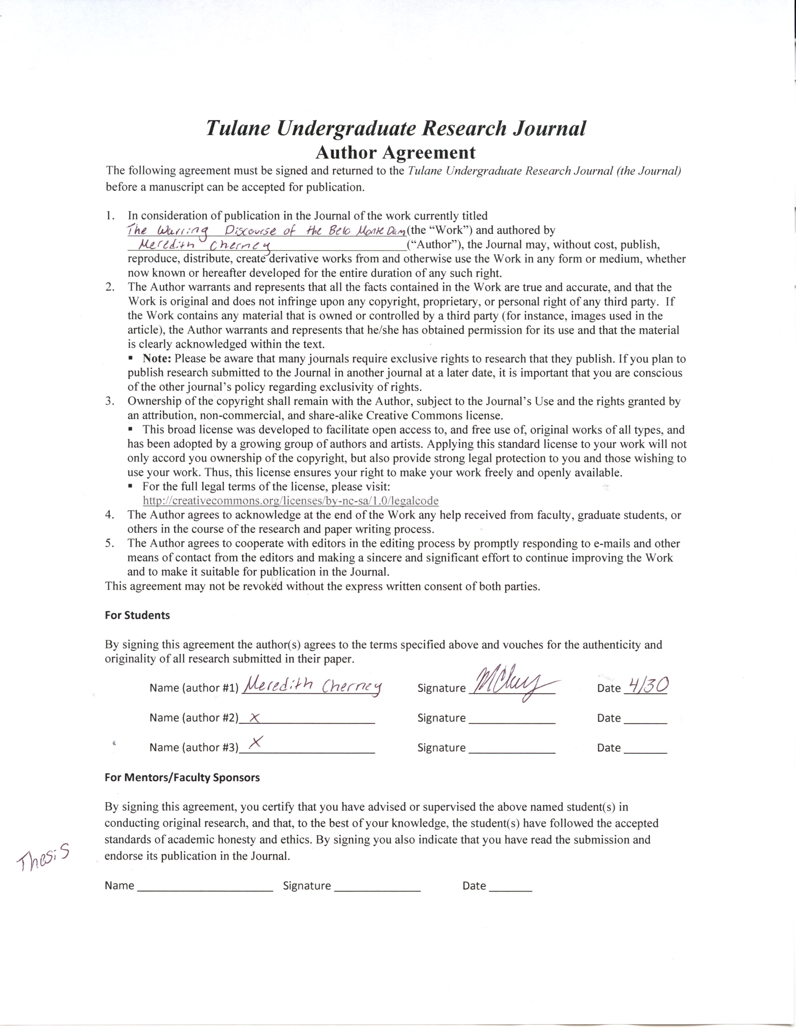 Tulane Undergraduate Research Journal is an open-access journal, so articles will be released under a Creative Commons Attribution-Noncommercial-NoDerivs CC-BY-NC-ND 3.0 Unported license, allowing the free dissemination of the work for noncommercial purposes. Authors retain copyright to the work and grant the journal right of first publication with the work simultaneously licensed under the Creative CommonsAttribution-NonCommercial-NoDerivs 3.0 Unported (CC BY-NC-ND 3.0) [see http://creativecommons.org/licenses/by-nc-nd/3.0/legalcode]; authors further grant the journal a waiver of clause 4(b) [restriction against commercial advantage or private monetary compensation]. If the journal rejects the work, the journal simultaneously waives the granted right of first publication.